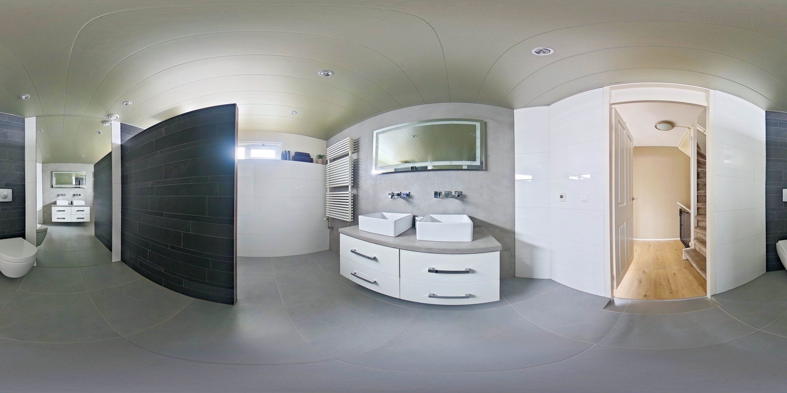 De badkamer is modern en royaal met een inloopdouche met regendouche en een dubbele wastafel. De verwarmde spiegel boven de wastafel beslaat niet, wel zo comfortabel.
