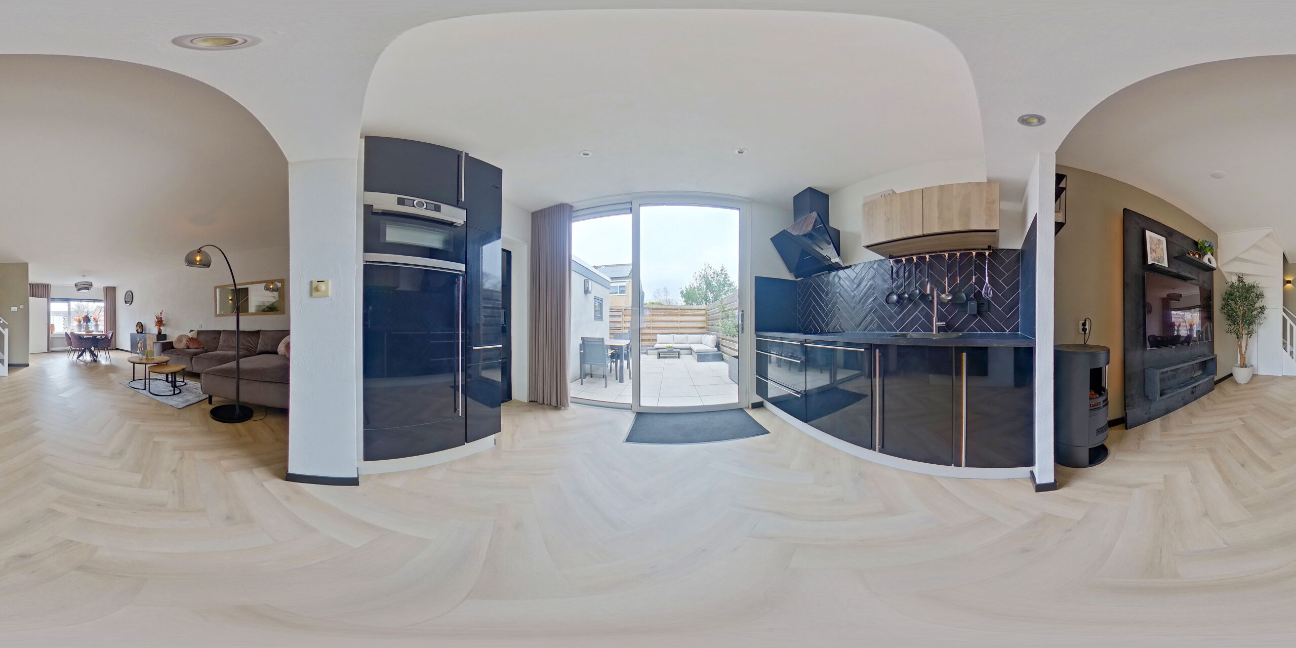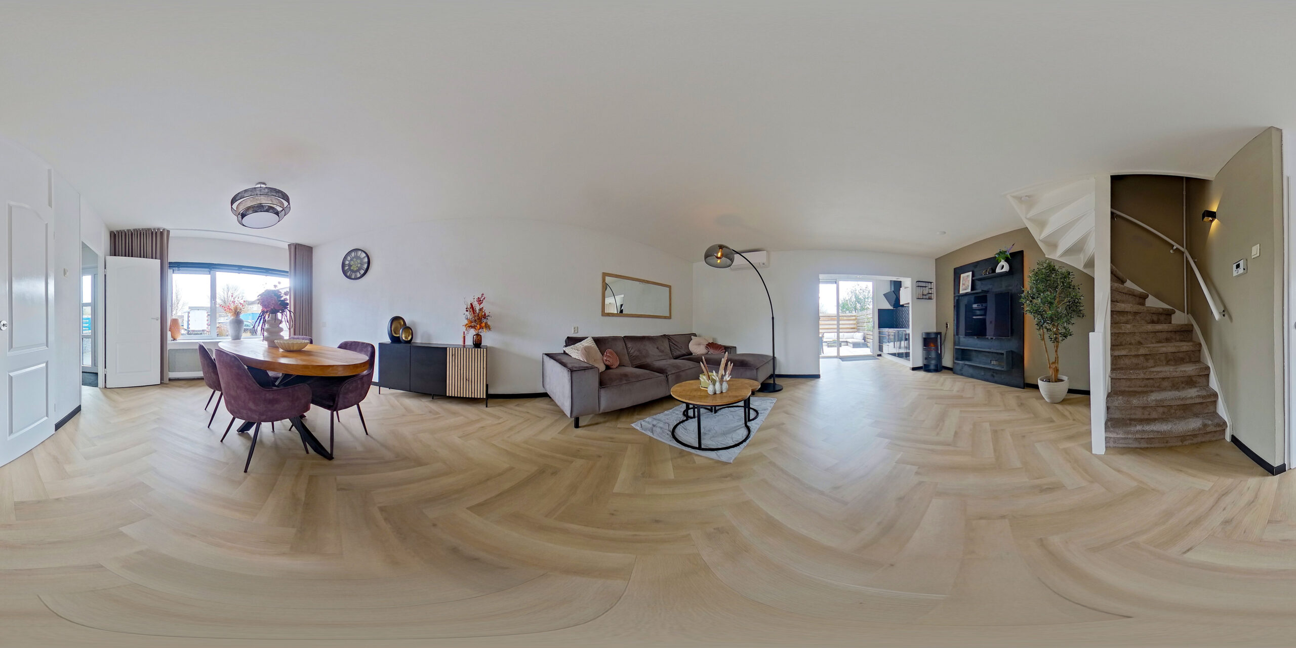 Je stapt binnen in de hal met meterkast en een modern toilet (2024) met fonteintje. Vanuit hier loop je zo de grote, lichte woonkamer in met een stijlvolle PVC visgraatvloer en vloerverwarming (2022). Dankzij de grote ramen valt er volop daglicht naar binnen en de open indeling maakt de ruimte gezellig én praktisch. De trap is slim in de hoek verwerkt, waardoor er maximale leefruimte overblijft.