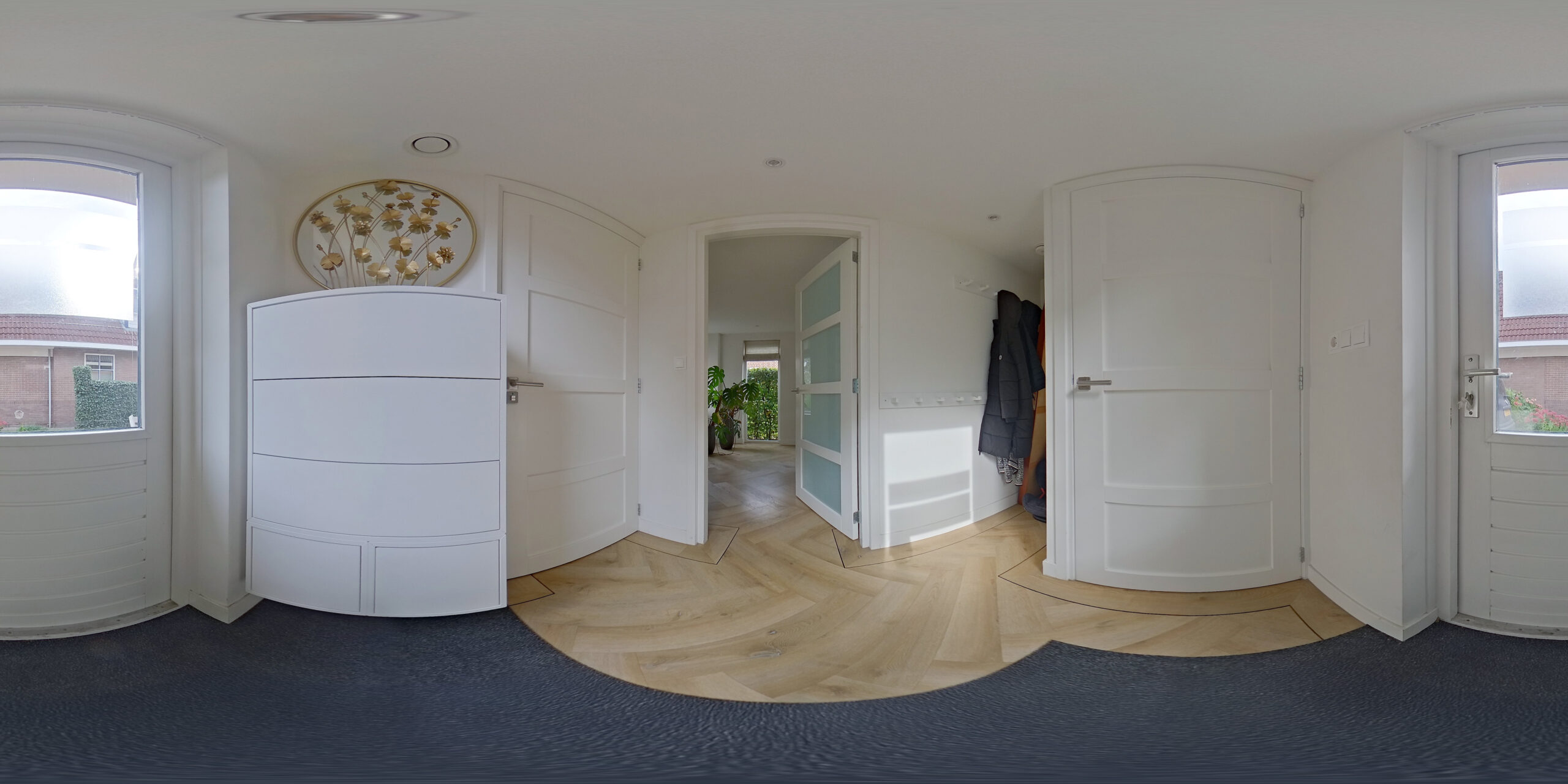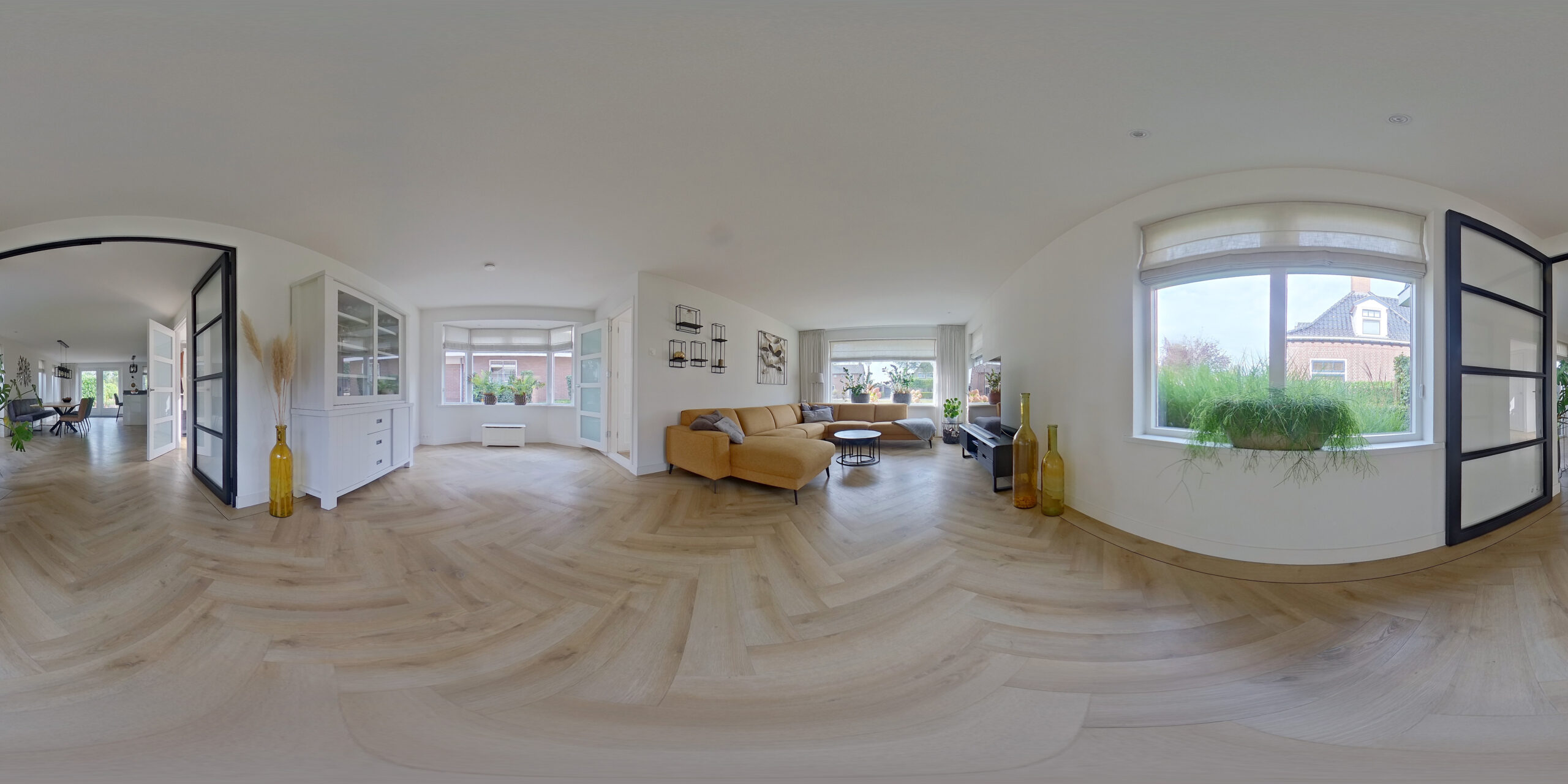 De eerste indruk is sfeer. De visgraat-PVC vloer met subtiele zwarte bies verbindt woonkamer en leefkeuken tot één vloeiend geheel. Zwarte openslaande en-suitedeuren kaderen het zicht en geven de ruimte karakter. In de handgemaakt leefkeuken staat alles in dienst van koken en samenzijn: een U-opstelling met royaal werkblad en een prettig bargedeelte waar je zo aanschuift voor koffie of huiswerk. Koken doe je op inductie met geïntegreerde afzuiging; stoomoven en combi-oven welke klaar staan voor gebruik. AEG-apparatuur, een Quooker met zeeppomp maken de keuken met openslaande tuindeuren compleet. Tussen woonkamer en keuken ligt de zij-entree met toilet en fontein, plus een praktische berging met ketelopstelling en mechanische ventilatie. In de hal vind je de meterkast, de trap naar boven en een fijne trapkelder.