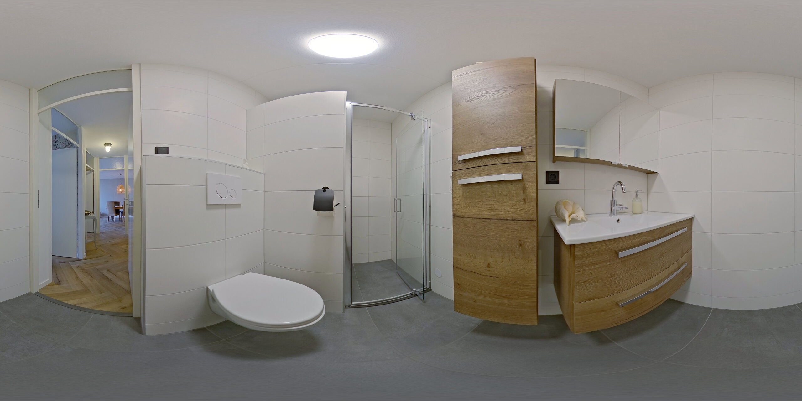 De compleet vernieuwde badkamer heeft een ruime douchehoek, voorzien van een praktisch ingebouwd douchebankje. Daarnaast vindt u hier een modern wastafelmeubel en een toilet. De frisse, eigentijdse afwerking zorgt voor een luxe uitstraling.