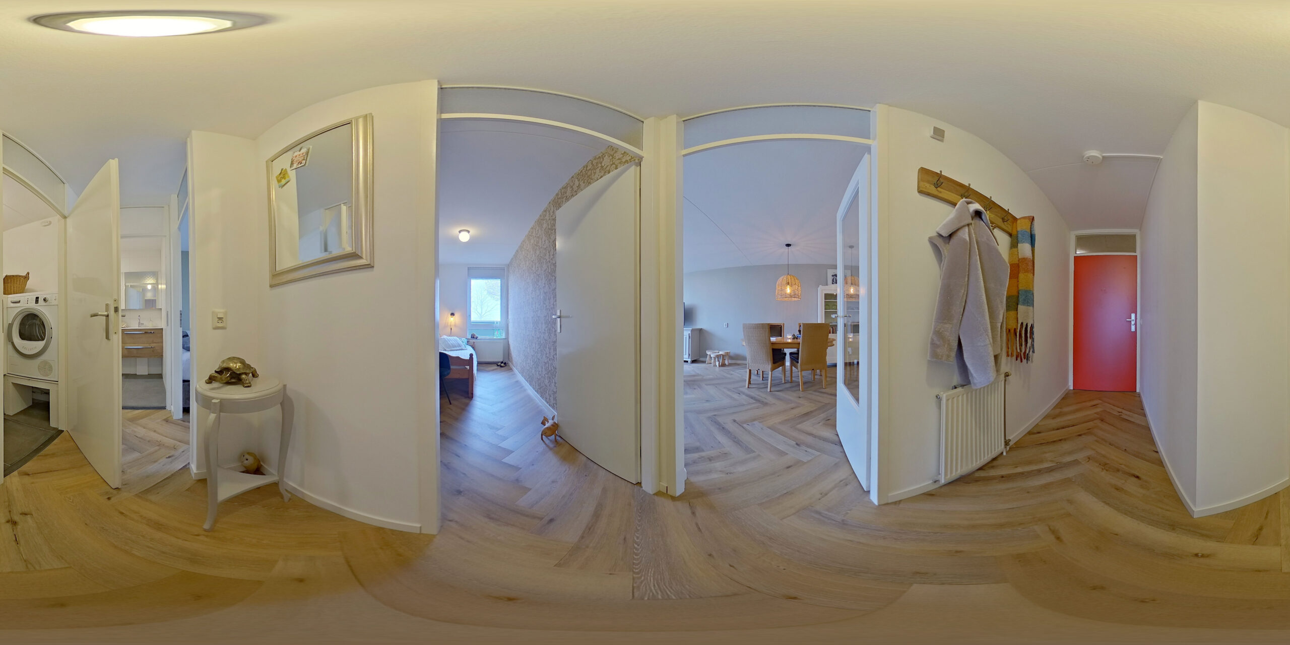 Via de ruime centrale hal bereikt u de woonkamer, badkamer, beide slaapkamers en de inpandige berging met CV ketel en mechanische ventilatie.