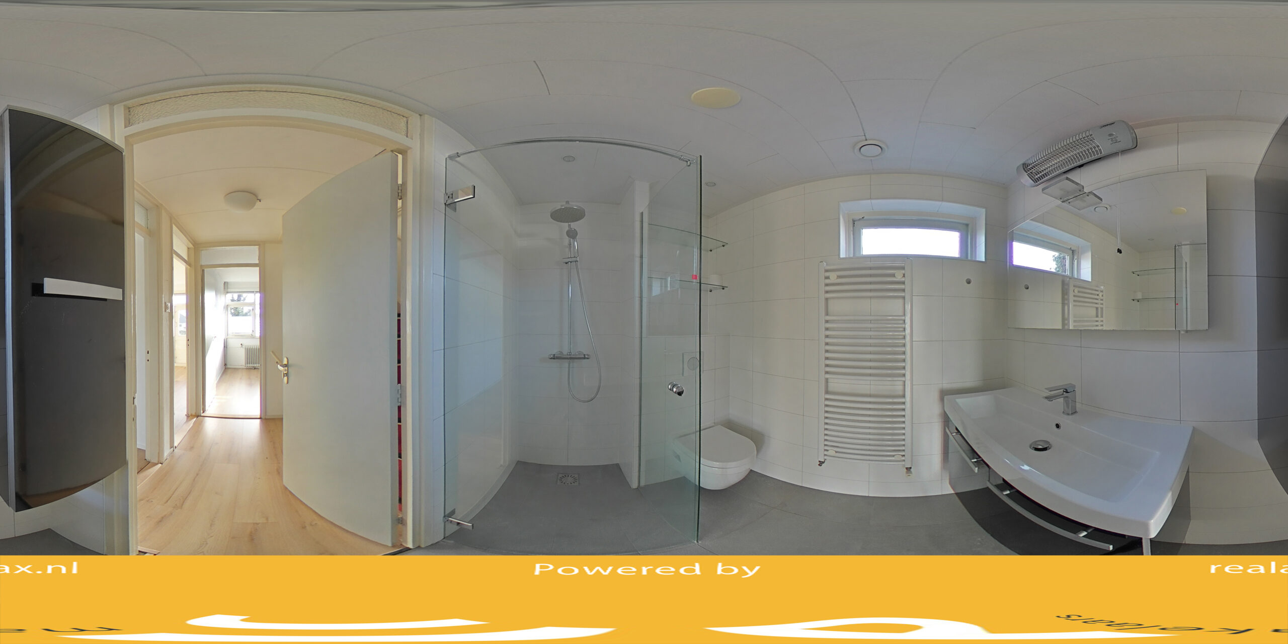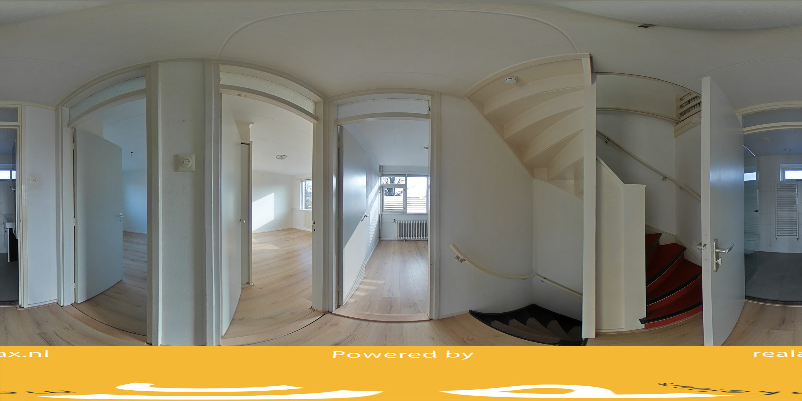 Overloop met toegang tot drie slaapkamers waarvan twee voorzien van vaste kasten (ca. 13, 9 en 6 m2), badkamer met douchecabine, wastafelmeubel en toilet.