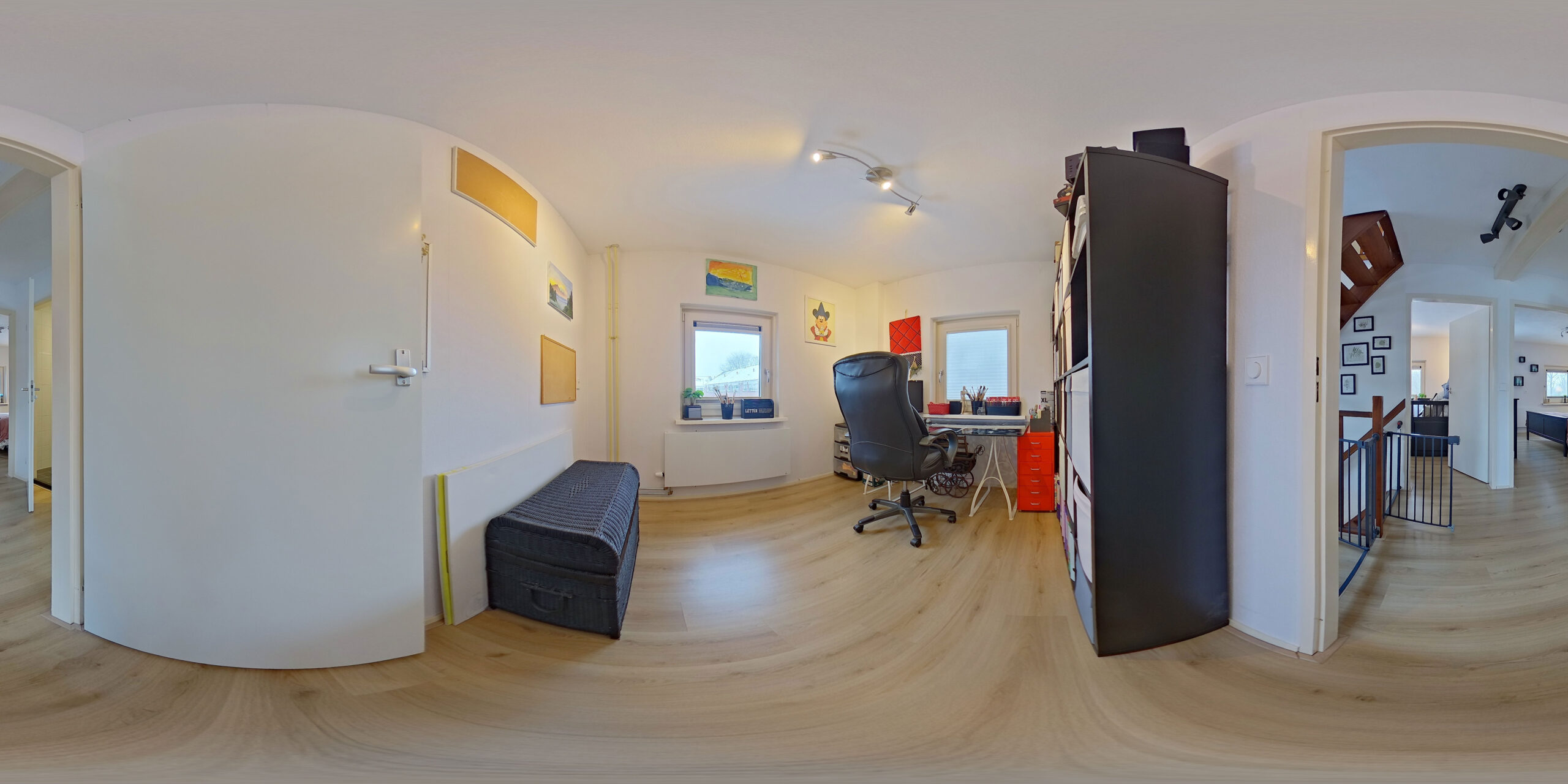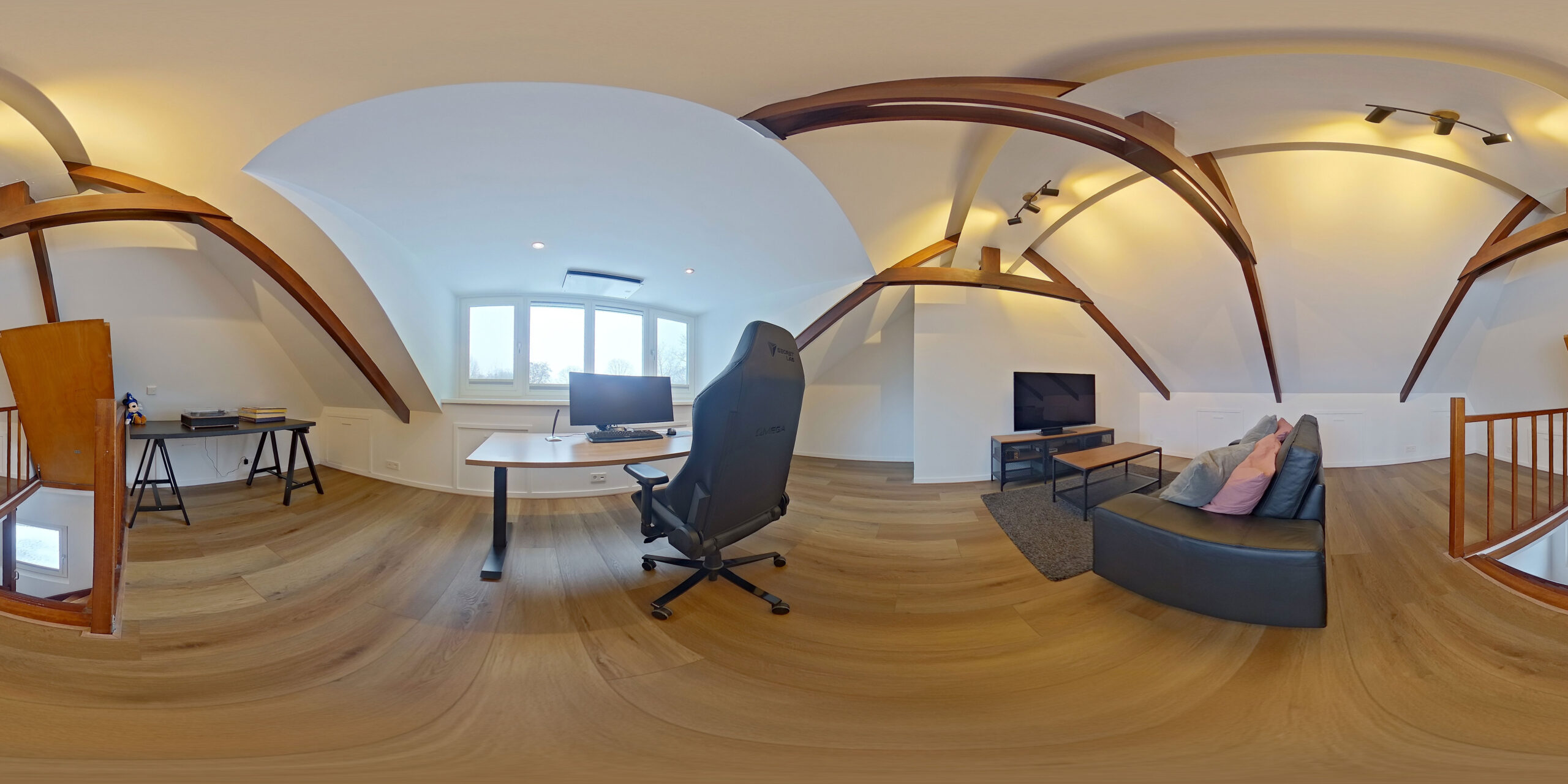 Dankzij de recent geplaatste dakkapel is deze ruime zolder ontzettend veelzijdig: perfect als thuiswerkplek, relaxruimte, speelkamer of als riante vijfde slaapkamer. Ook de stookruimte is hier netjes weggewerkt.