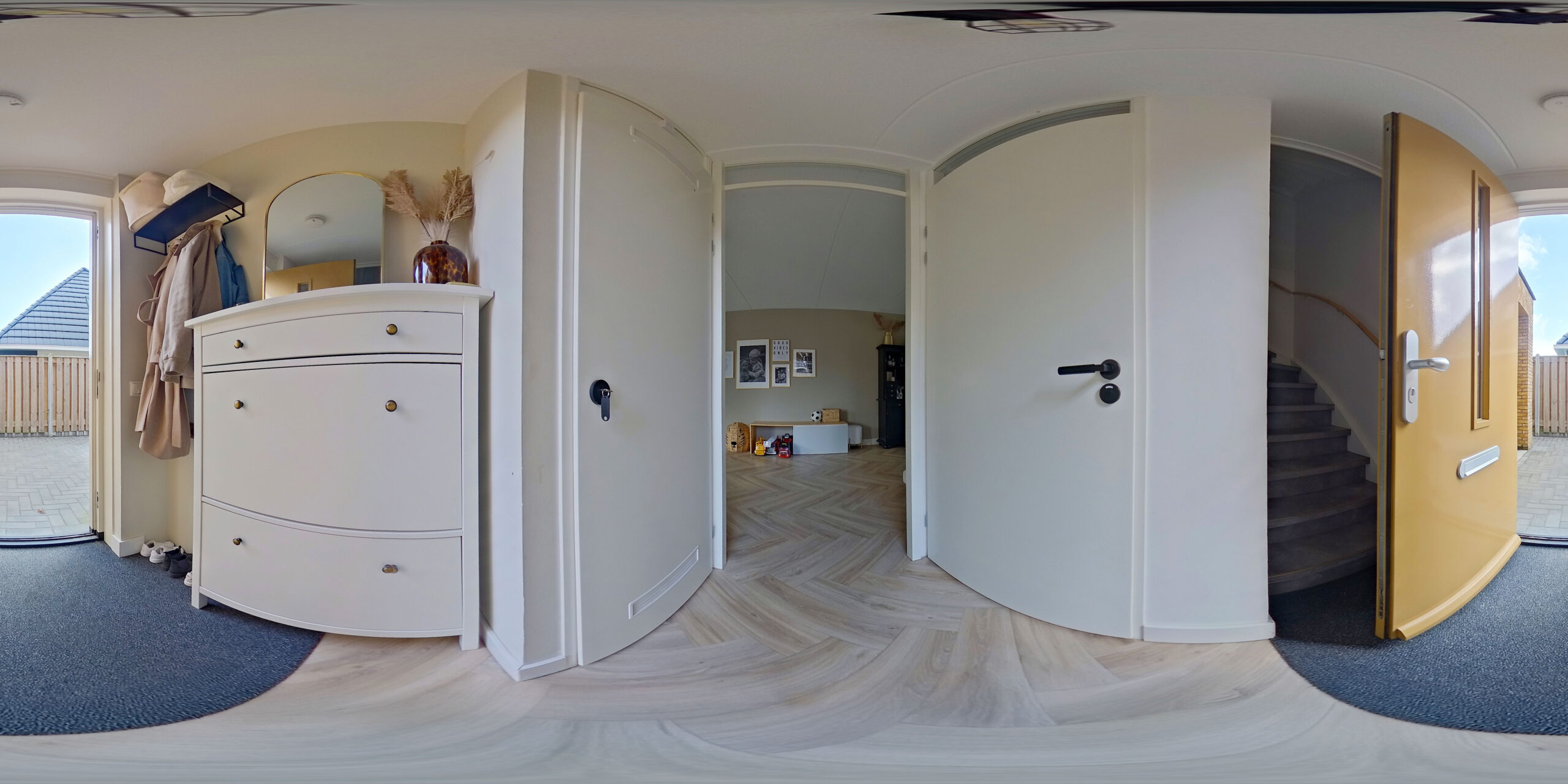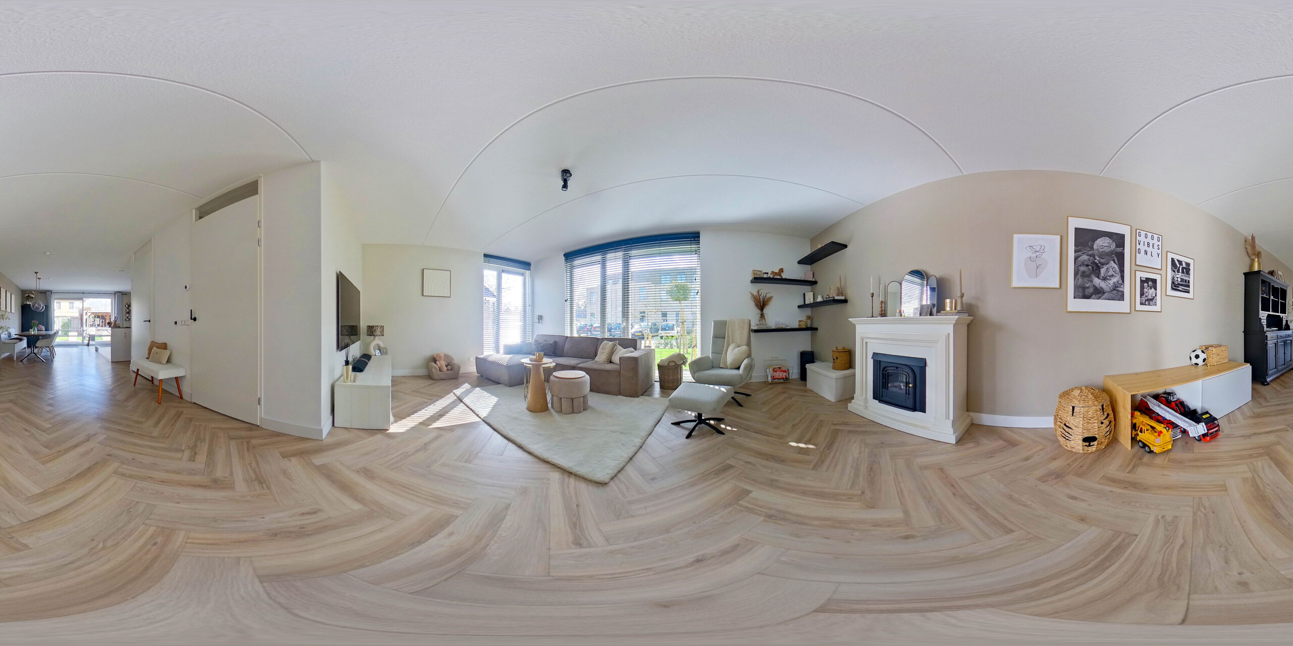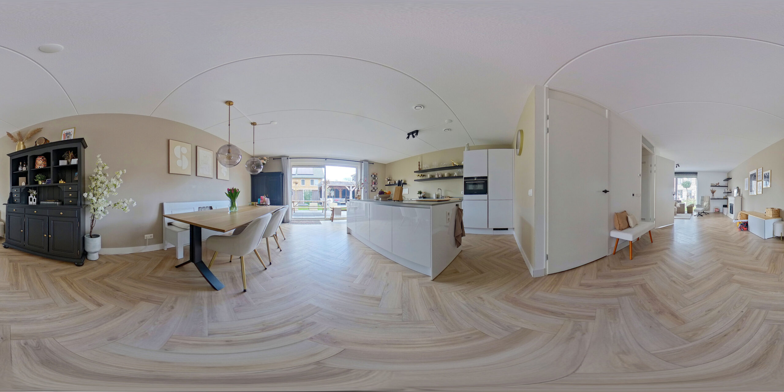 Entree/hal met trapopgang, uitgebreide meterkast (met waterontharder) en moderne toiletruimte. De woonkamer heeft een prettig lichtinval en is afgewerkt met een stijlvolle pvc-visgraatvloer met vloerverwarming. De open keuken beschikt over een moderne en luxe keukeninrichting en is voorzien van een kookeiland, inductiekookplaat met kookveld-afzuiging, combi-oven, vaatwasser en koel-vriescombinatie. De schuifpui geeft de keuken veel licht en toegang tot de achtertuin.